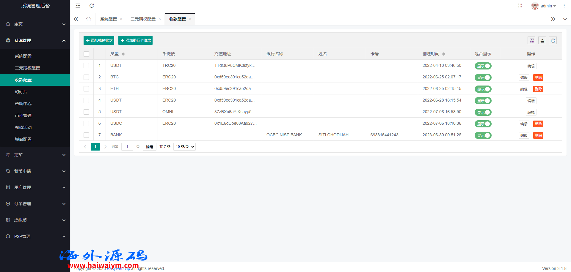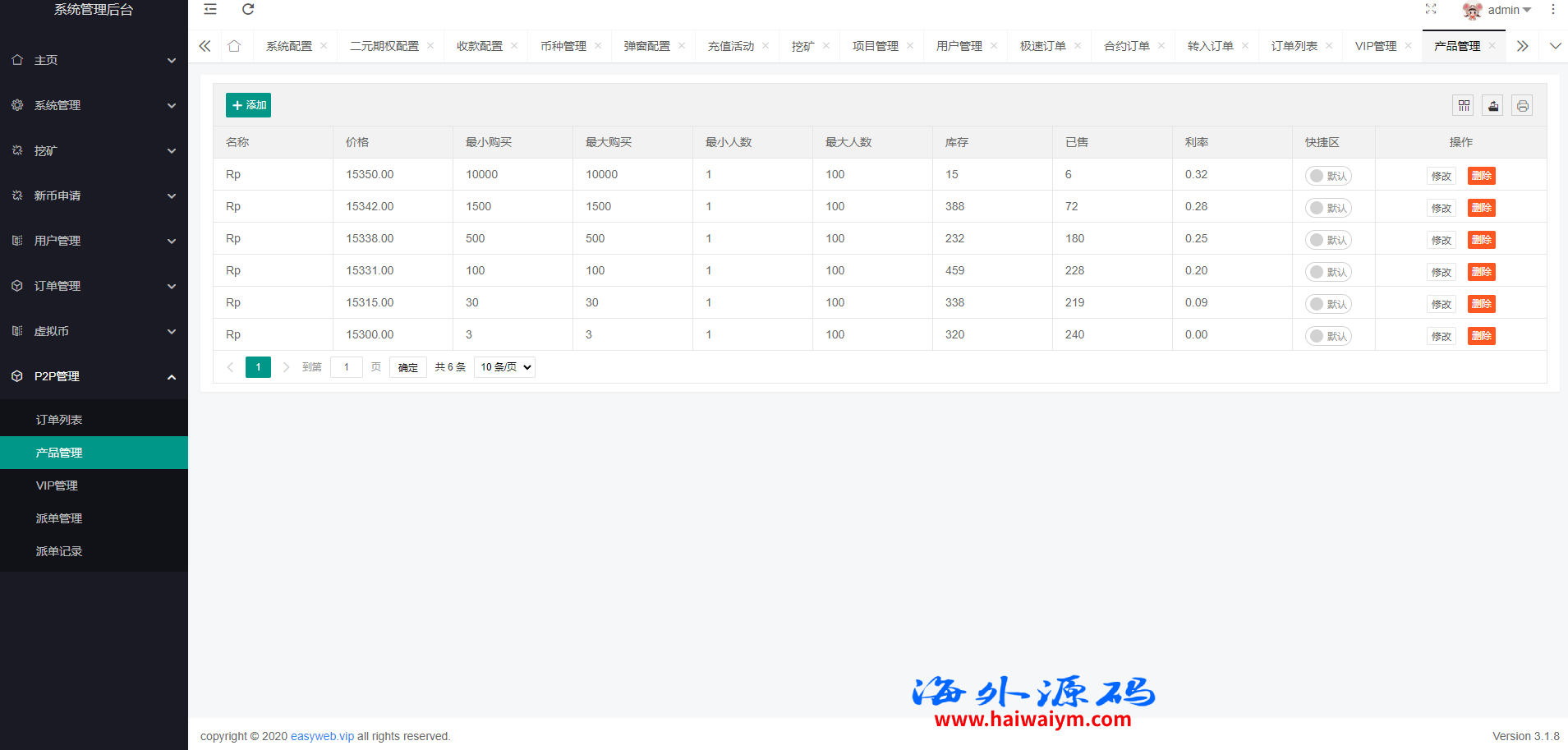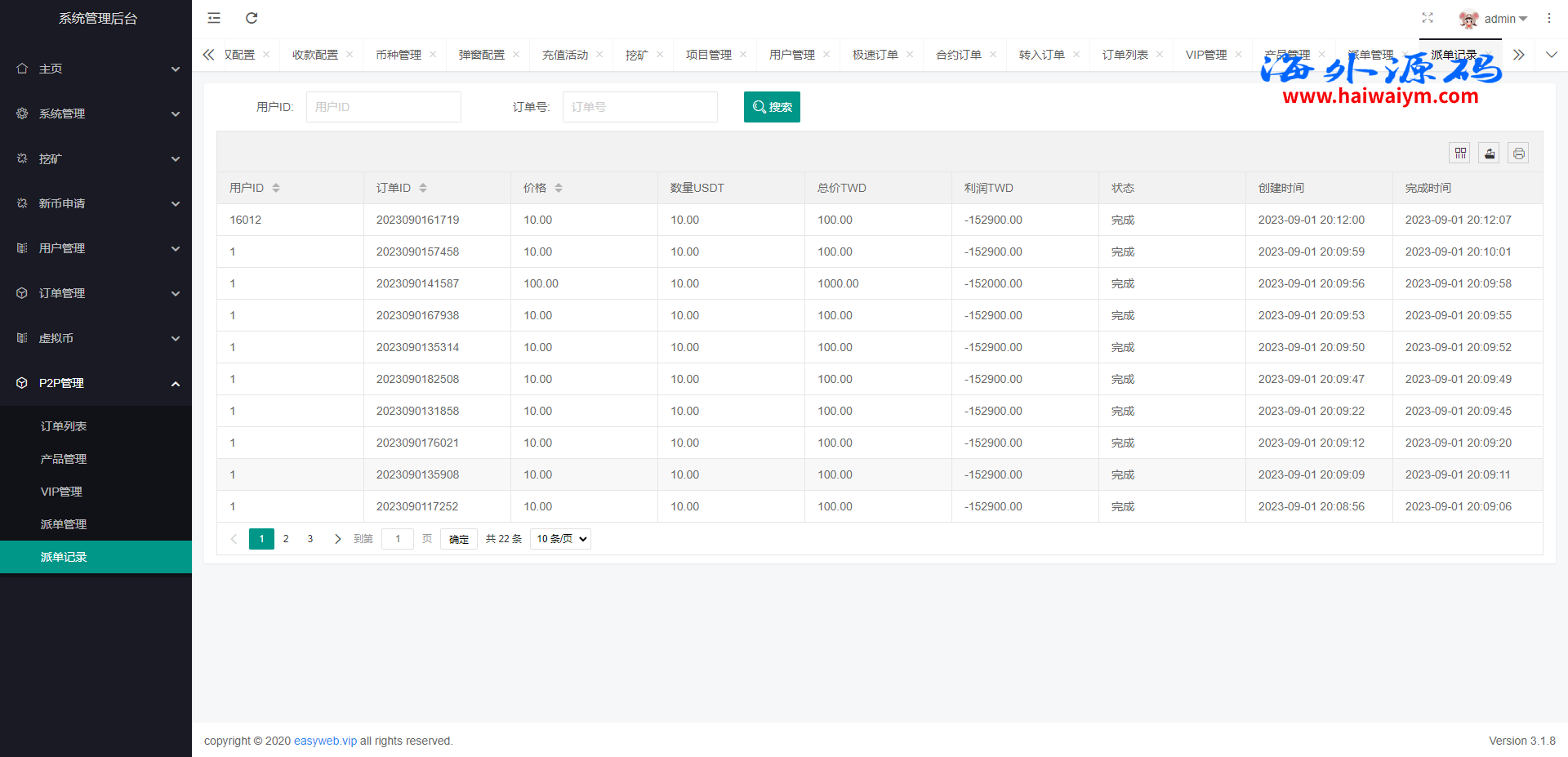 系统新增p2p理财功能、派单抢单功能,支持锁仓质押、三级分销、下单限制等功能
