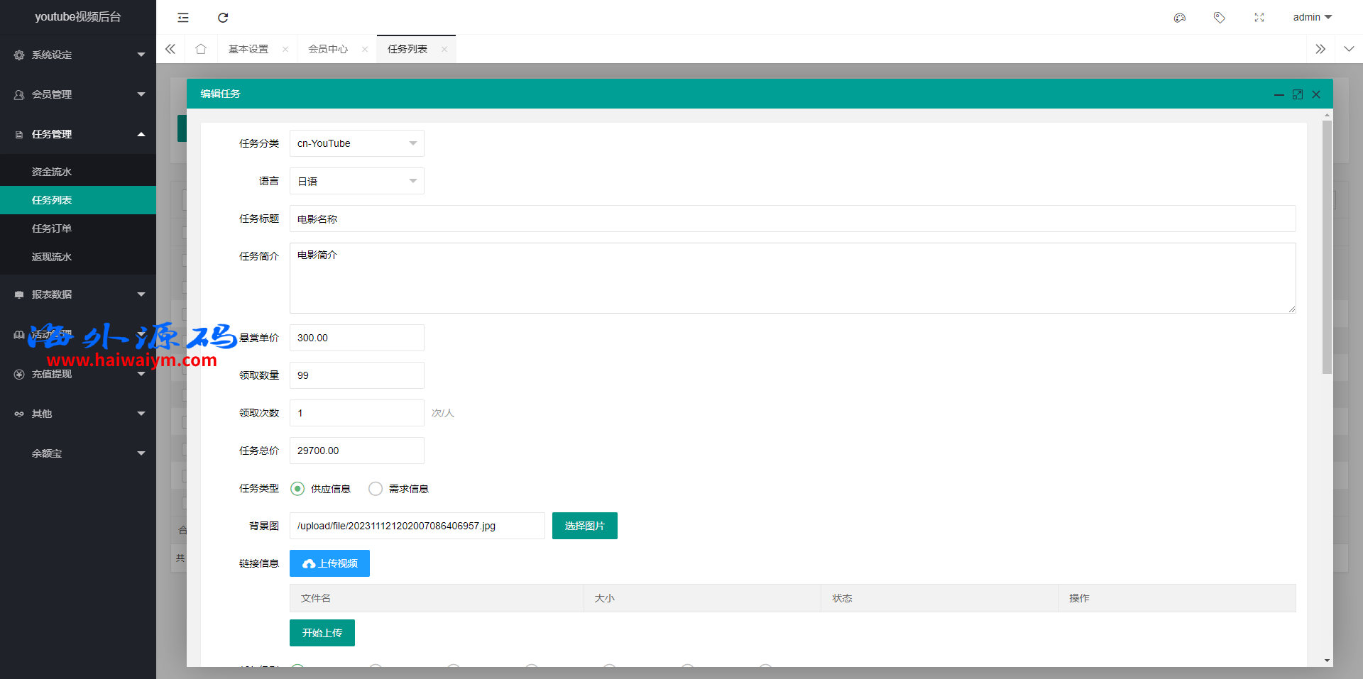 前端源码带多语言默认只有日语,后台添加任务可上传视频